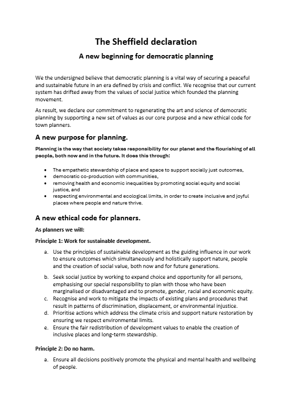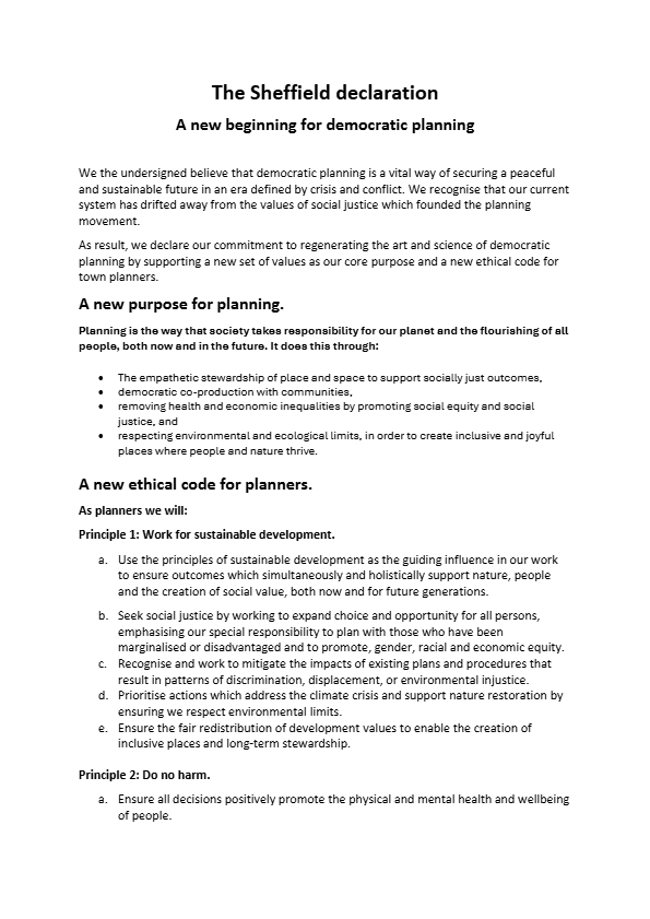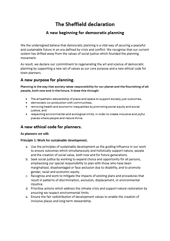 The Sheffield Declaration brings together a new Purpose for Democratic Planning and Ethical Code for Planners.