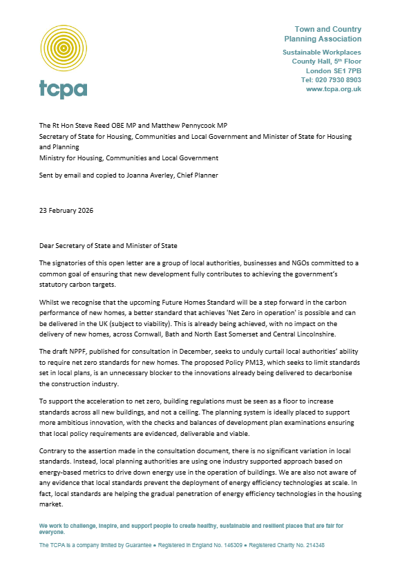 In a letter to the Rt Hon Steve Reed MP, the Secretary of State for Housing, and Matthew Pennycook MP, the Minister of State for Housing and Planning, coordinated by the Town and Country Planning Association (TCPA), the group states that the draft planning polices would limit local authorities from setting high environmental standards for new homes. The letter says this is an unnecessary blocker to innovation which will stall the decarbonisation of the construction industry.